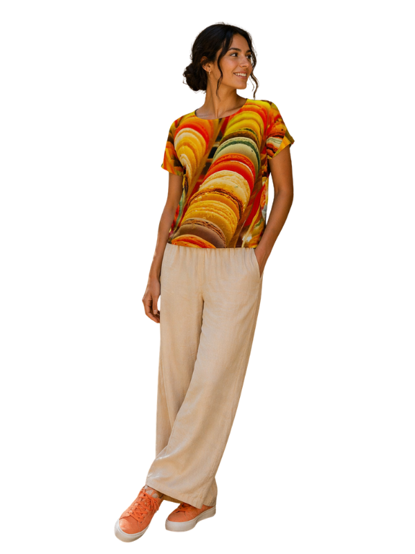 Diese Hose ist wie ein Ausflug in eine französische Pâtisserie. Zarte Farbverläufe, harmonische Töne und diese süße Leichtigkeit, die sofort gute Laune macht. „Macarons“ steht für Genuss, Verspieltheit und die kleinen, schönen Momente im Leben.
