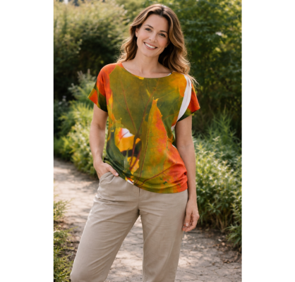Die hochwertige Viskose sorgt für ein angenehm luftiges, leicht kühlendes Tragegefühl – perfekt für warme Spätsommertage oder die ersten goldenen Herbstmomente. Ein Shirt, das mit den Jahreszeiten mitgeht.